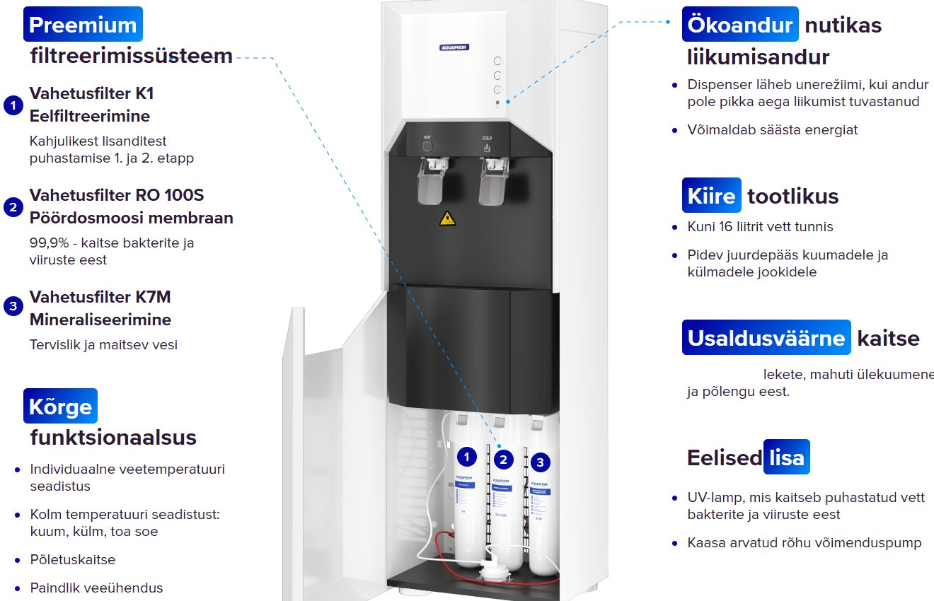 AQUAPHOR RO PRO 100 joogiveeautomaat puhastab kraanivee kvaliteetseks külmaks ja soojaks joogiveeks.