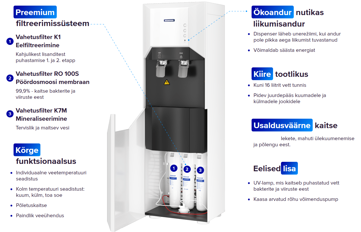 AQUAPHOR RO PRO 100 joogiveeautomaat puhastab kraanivee kvaliteetseks külmaks ja soojaks joogiveeks.